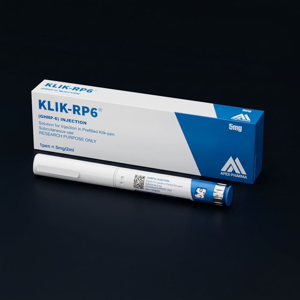 GHRP-6 (Growth Hormone Releasing Peptide-6) is a synthetic hexapeptide (His-D-Trp-Ala-Trp-D-Phe-Lys-NH2) and one of the first GHRPs discovered. Each KLIK-RP6 pen contains 5mg/2ml. It acts on the ghrelin/GHS-R1a receptor to stimulate GH release and increase appetite. Research indicates it may also have gastroprotective properties and influence cortisol and prolactin levels modestly compared to GHRP-2.