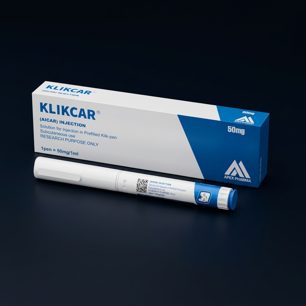 KLIKCAR contains AICAR (5-Aminoimidazole-4-carboxamide ribonucleotide), a cell-permeable nucleoside analogue that activates AMP-activated protein kinase (AMPK). Each pen contains 50mg/1ml. AMPK is a master metabolic sensor that triggers fatty acid oxidation, glucose uptake, and mitochondrial biogenesis when activated. Research has shown AICAR can mimic many metabolic benefits of exercise, including enhanced endurance capacity and improved insulin sensitivity, without physical activity.