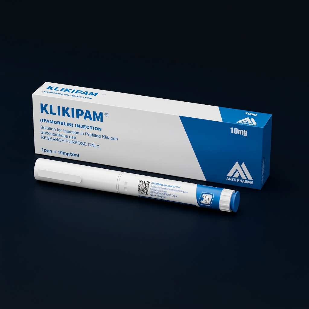 Ipamorelin is a pentapeptide (Aib-His-D-2Nal-D-Phe-Lys-NH2) that selectively stimulates growth hormone release from the pituitary gland. Unlike other GH secretagogues, it does not significantly elevate ACTH, cortisol, or prolactin levels, making it highly selective. Each KLIKIPAM pen contains 10mg/2ml for subcutaneous research use. Studies focus on its potential for lean body mass preservation, bone density improvement, and age-related GH decline research.
