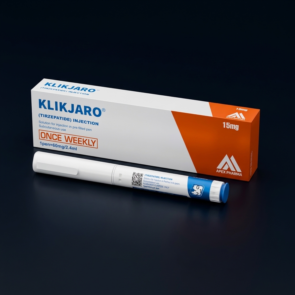 KLIKJARO contains tirzepatide, the first dual glucose-dependent insulinotropic polypeptide (GIP) and GLP-1 receptor agonist. Each pen contains 60mg/2.4ml (4 doses of 15mg). Its 39-amino acid sequence is based on the GIP sequence with modifications enabling GLP-1 receptor co-activation. A C20 fatty diacid moiety enables albumin binding for once-weekly dosing. Research demonstrates superior efficacy in glycemic control and weight reduction compared to selective GLP-1 agonists.