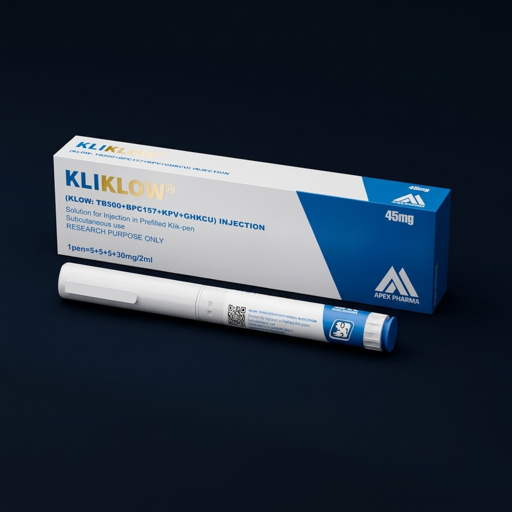 KLIKLOW is a quad-combination pen containing TB-500 (5mg), BPC-157 (5mg), KPV (5mg), and GHK-Cu (30mg) in 2ml solution. This advanced formulation adds the potent anti-inflammatory KPV tripeptide to the regenerative trio found in KLIKGLOW. The addition of KPV provides NF-κB pathway inhibition and cytokine modulation, making this combination ideal for research involving inflammatory tissue damage, gut healing, and immune-mediated tissue repair.