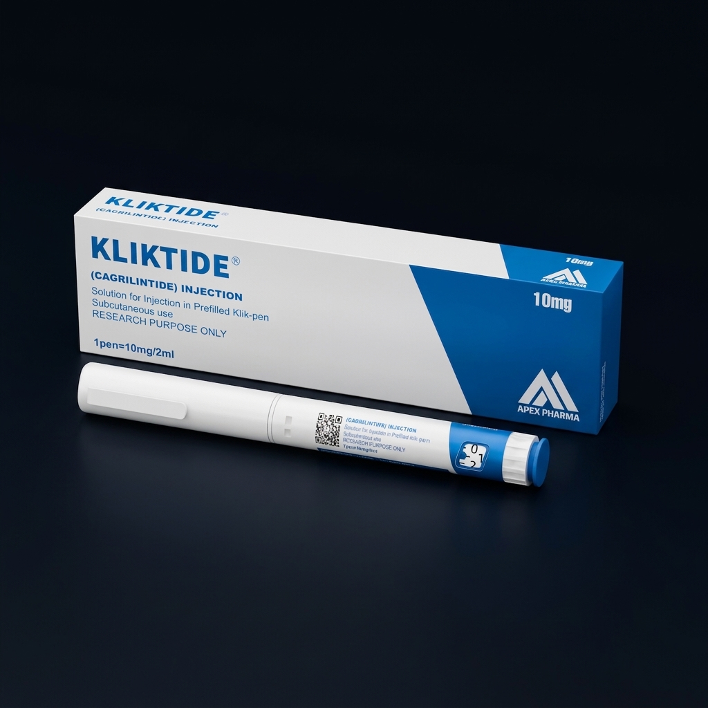 KLIKTIDE contains cagrilintide, a novel long-acting acylated amylin analogue designed for once-weekly subcutaneous administration. Each pen contains 10mg/2ml. Cagrilintide activates the amylin receptor (AMY1 and AMY3), which plays a key role in satiety signaling, gastric emptying, and post-prandial glucagon suppression. Research has demonstrated significant weight loss as monotherapy and synergistic effects when combined with GLP-1 agonists (CagriSema trials).