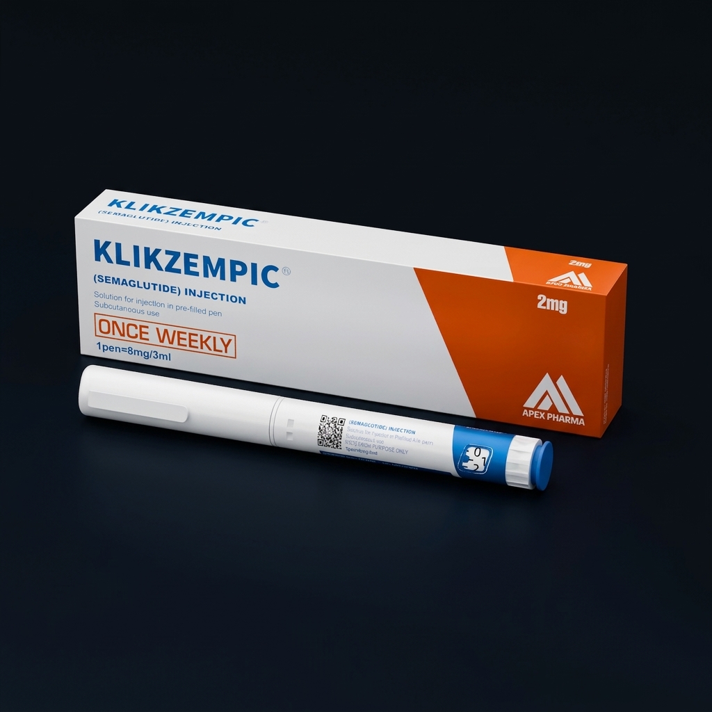 KLIKZEMPIC contains semaglutide, a long-acting GLP-1 receptor agonist with 94% structural homology to native GLP-1. Each pen contains 8mg/3ml (4 doses of 2mg). An amino acid substitution at position 8 and a C-18 fatty di-acid chain enable albumin binding, extending the half-life to approximately 7 days. Research focuses on glycemic control, appetite regulation, cardiovascular risk reduction, and neuroinflammation pathways.
